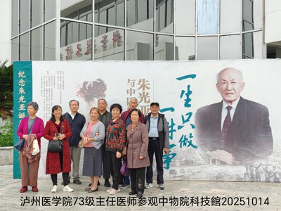 2025年10月14日上午,原泸州医学院1973级工农兵大学生张由良教授等一行8人,从成都、遂宁、攀枝花米易县等地齐聚绵阳,前往中物院科技馆与“两弹一星”纪念馆开展参观学习。这是他们退休后的首次集体探访,绵阳市关工委科技团团长张光明(成都电讯工程学院毕业)全程陪同并讲解。一行人于9时抵达场馆,随即开启参观之旅,最终在展厅前合影留念,为此次精神之旅画上圆满句号。
