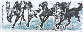 笔下八骏踏雪,毫端万象生春。昔日栽桃培李意,今岁挥毫绘锦麟。豪情老更真。