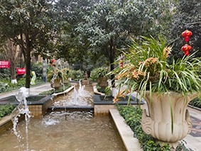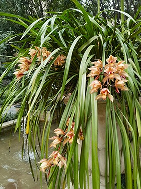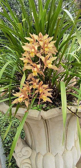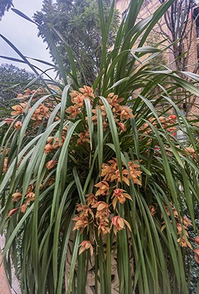 小区的虎头兰遍植于中庭那条宽阔大气的廊道上,长廊以一条层叠流溢的水景带为中心,由南向北笔直地贯穿整个小区,廊道两边数十上百方类似西方罗马柱的础台上,都托举着一只典雅的西式仿玉石花盆,盆里尽植虎头兰,花盆与花盆之间,由桂花树巧妙间隔,形成高矮错落且色香俱佳的一道风景线。廊道的两侧,栽种的绿化树有高大而珍贵的楠木、一年两次换叶的椿树,以及槐树、榉树,等等。虎头兰一年四季绿丛悬挂,青翠盎然,与高大绿植共同营造出相映成趣的小区中心画廊。虎头兰那自然舒张又规则垂挂、自成绿灯笼状的秀美造型,通常也打扮着小区的其他路径,使人才入幽径三五步,便遇蕙兰一二丛。更为有趣的是,小区的每栋楼訒的每一个单元门口,也都矗立着两盆繁盛的虎头兰,犹如古代官府衙门前的石狮子,却又多了些婉约与温柔,一年四季忠诚地守护着业主的安宁,也恰到好处地雅致着业主的心绪。