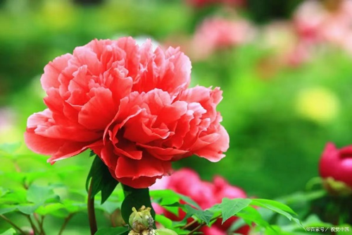 一开始,我以为那些开得正艳的芍药也是牡丹,因为二者实在有些相似,便拍了照片发朋友圈炫耀,结果有识花朋友戏谑道:“这是典型花盲,居然拿宰相当了国王”。搞得我很没有脸面。于是寻得几株迟开的牡丹相比较,发现二者虽然看上去极其相似,但仔细辨别,还是会发现存在较大区别。牡丹植株长得高大,后来查资料得知,其属木本植物,可长到2米高。而芍药,是草本植物,高不过1米,植株相对矮小。牡丹通常在每年农历三月底即相继盛开,而芍药要到四月中旬才会完全绽放,二者花期相差15天左右。或许正是因为如此,《贺花神》节目才选择四月致敬芍药。牡丹花朵皆着生于花枝顶端,多单生,花朵硕大,花径可达20厘米左右;而芍药的花朵常常为族生,花径明显小于牡丹,一般只能开到15厘米左右。牡丹叶片偏灰绿,与花朵的鲜艳相反,暗然无光,但花色丰富,尤其是经千百看来人类的不懈培植创新,红绿紫黛蓝,几乎你能想到的花色都有,五颜六色,奇卉异朵,花样百出;而芍药花的花色则相对单调,无外红白粉黄橙紫几个品类,远没有牡丹的花色丰富。