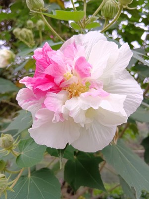 在我看来,木芙蓉花不但象征着坚韧与不屈、纯洁与秀美,也象征着富贵与吉祥、大气与华丽。木芙蓉花盛开时所呈出来的花大色艳、形态丰满,完全可以与倾国倾城的牡丹花相媲美,令人联想到雍容华贵、大气典雅。而其一天内“醉日三变”的品性,又展现出它那顺时应变,灵动敏捷的一面,寓意着不落窠臼、与时俱进的求变求新之积极心态,像极了川人、成都人那坚毅勇敢、仁义厚道、泼辣豪爽、乐观幽默、善于创新的人格秉性与处事特征。