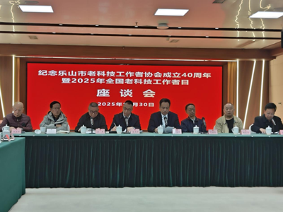 乐水三江,滔滔不尽,笑浪歌潮迭起;嘉州万象,郁郁常新,夕阳科技云驰。昔共和卅八年,改革春雷震九域;时维桃花怒放,退休科技结盟旗。三载砥砺,更名为市会;十届传承,聚智展雄奇。科技关爱,立老年大学;农工水城,兴文教医畦。科普报告启民智,书画艺术润心脾。千余会员,共探春华秋实;卌载耕耘,长铭硕果琼枝。