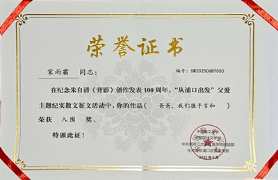 2025年上半年,中国散文学会会同中国现代文学馆、中共南京江北新区宣传和统战部、浦口区委宣传部联合举办“从浦口出发”——朱自清《背影》创作100周年·父爱主题纪实散文征文活动。获知征文信息后,宋雨霜在教学之余酝酿稿件,最终投上作品《爸爸,我们握手言和》。