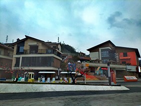 突然转身,发现大路旁驻立着一匹白马,穿着紫红外挂的主人,向大家打招呼,欢迎勇士们上馬驰行,免费服务。于是几位壮汉骑在白龙马上,拍照留影。