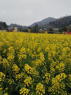 下了公交车,踏进城边黄金山村那片土地,风里就裹着油菜花的甜香,不是浓烈,是清亮亮的,带着霜露水气的香,带着惊蛰地下小生命萌动的热气。眼前,不是零星的几垄,而是整片大田,是整座山坳被金浪一层推着一层,漫到山脚,又悄悄爬上山坡,从一座小山推向另一座小山。远处山影淡青,天气晴明,反把那黄衬托得更真,更暖,更温馨。老友们笑着,瞧着,撫摸着,这哪是花田,是大地刚熬好的一锅蜜。