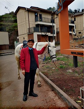 扶着温性的白龙马,心潮起伏,诗意涌动,这诗不在远方,就藏在老朽扶骏的手势里,诗,就藏在新村人家的红灯笼映在花蕊上的点点微光里。